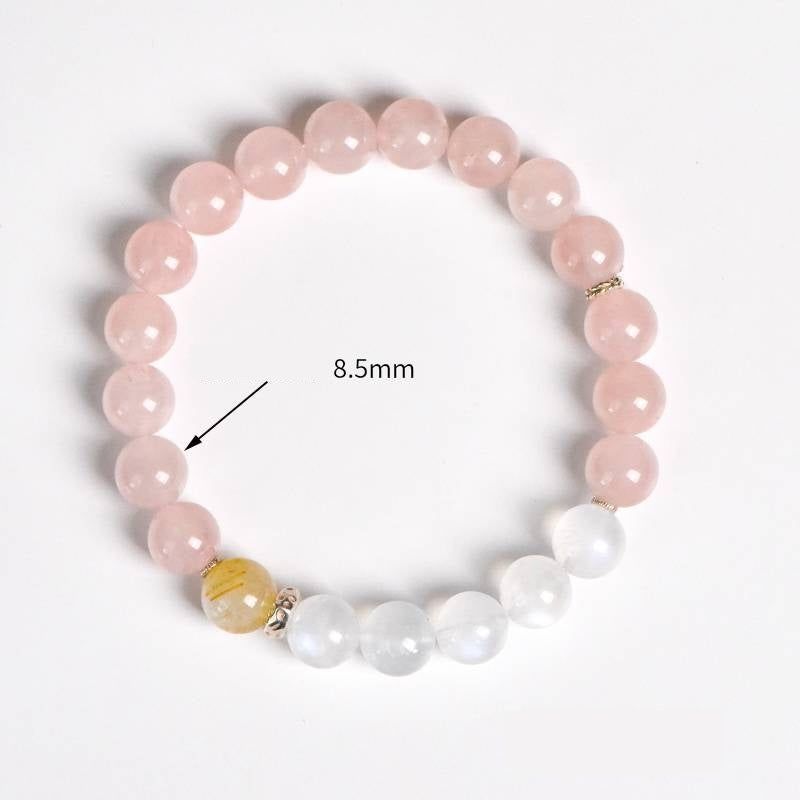 Embrace the harmony of love, intuition, and prosperity with our Tranquil Elegance: Rose Quartz, Moonstone & Golden Rutilated Quartz Bracelet. Designed with 8.5mm natural gemstone beads, this bracelet enhances emotional balance, inner wisdom, and personal growth.